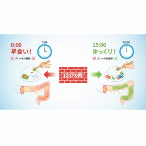 なぜなら、「回腸ブレーキ」が本格的に作動し始めるまでには、食べ始めてから約15分〜20分のタイムラグがあるからです。