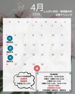 4月は環境の変化も多く、知らず知らずのうちに体へ負担がかかりやすい時期です。血圧の変動や体調の変化にもどうぞご注意ください。
